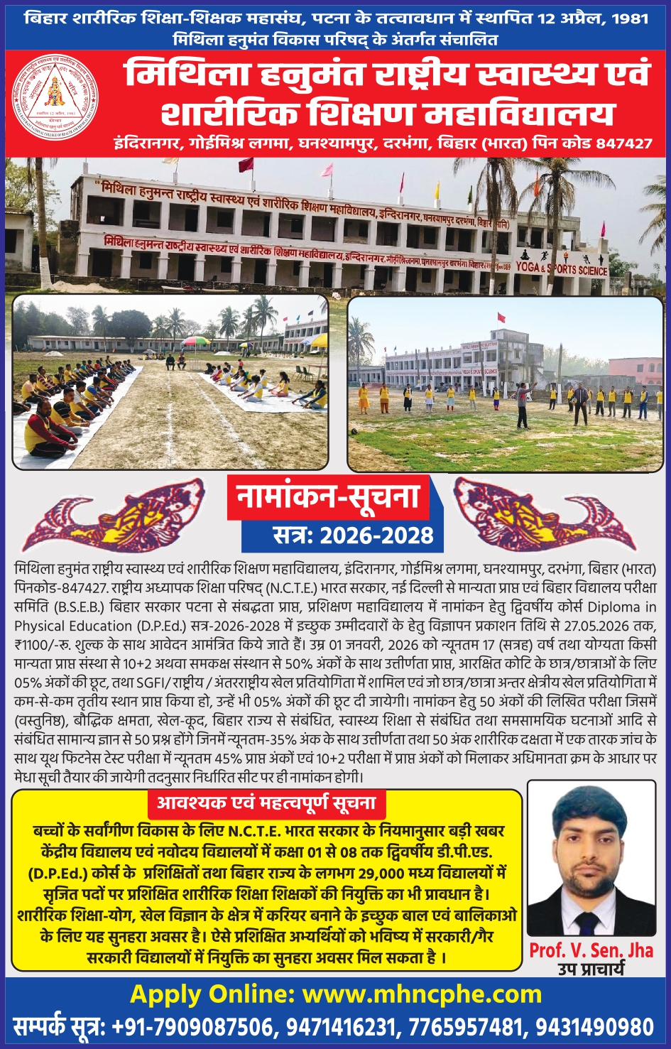 Mithila Hanumant National College of Health and Physical Education - MHNCHPE was established in 1982. The campus of the College is situated in Indira Nagar, Goi-Mishra Lagma, Ghansyampur, P.O.-Salepur Lagma, Dist.-Darbhanga, Bihar-847427 india. It is approved by Government of Bihar. Recognised By The Govt. Of Bihar, Department of Youth Affairs Sports and Culture