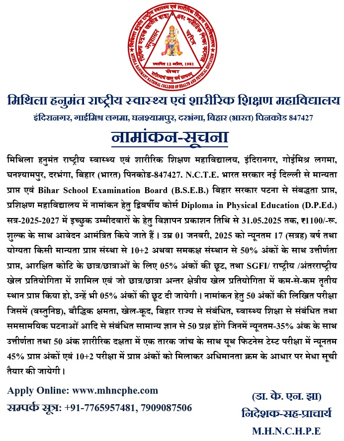 Mithila Hanumant National College of Health and Physical Education - MHNCHPE was established in 1982. The campus of the College is situated in Indira Nagar, Goi-Mishra Lagma, Ghansyampur, P.O.-Salepur Lagma, Dist.-Darbhanga, Bihar-847427 india. It is approved by Government of Bihar. Recognised By The Govt. Of Bihar, Department of Youth Affairs Sports and Culture